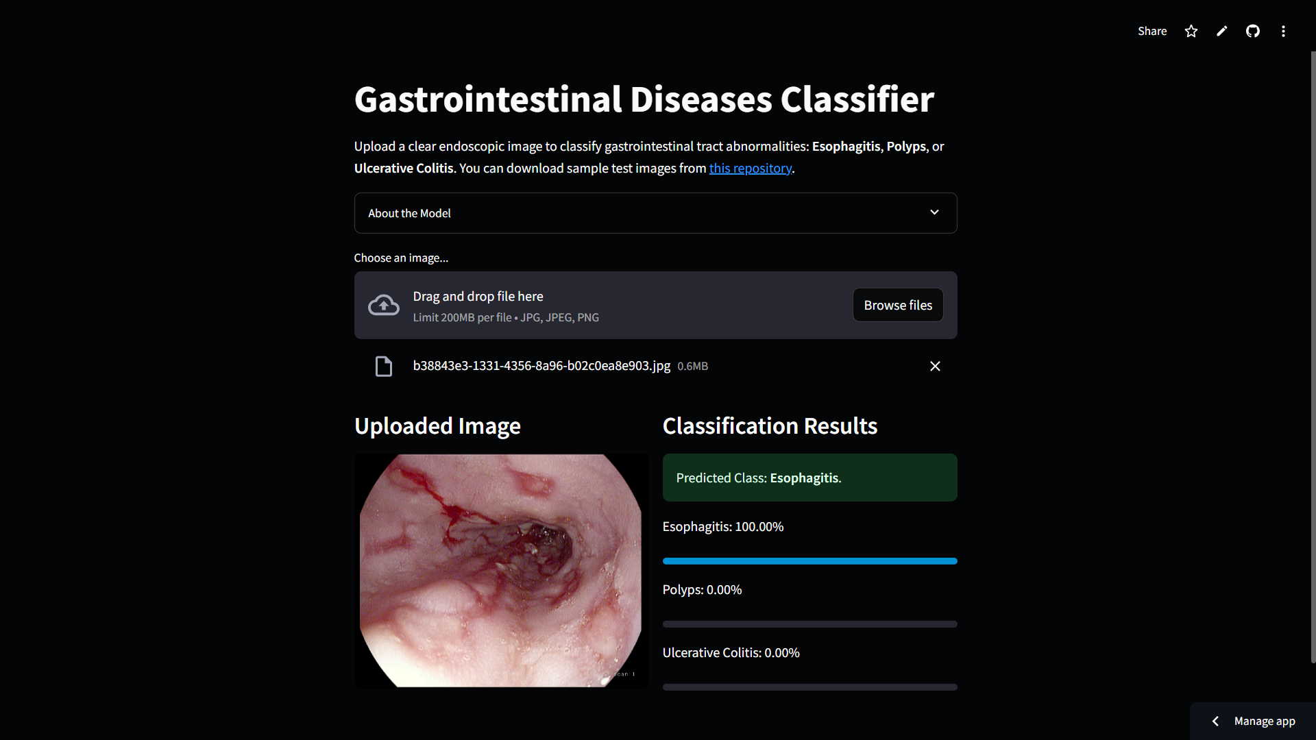 A Streamlit web app that uses deep learning model to classifies GI diseases from endoscopic images with 98% accuracy.