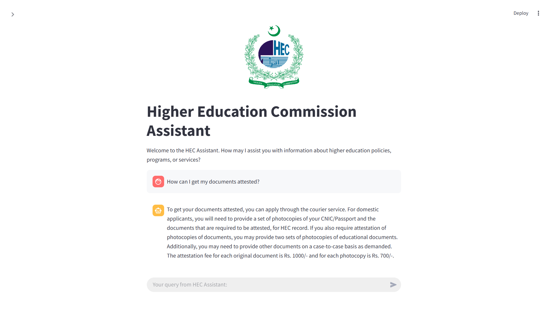 A GenAI-powered chat assistant leveraging RAG to deliver accurate, context-aware answers about the services, policies, and programs of HEC Pakistan.