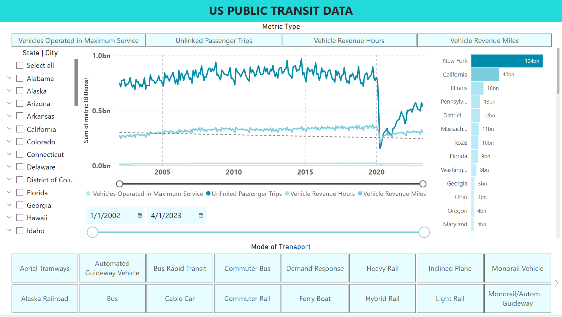 An interactive Power BI report visualizing public transit ridership trends across the USA.