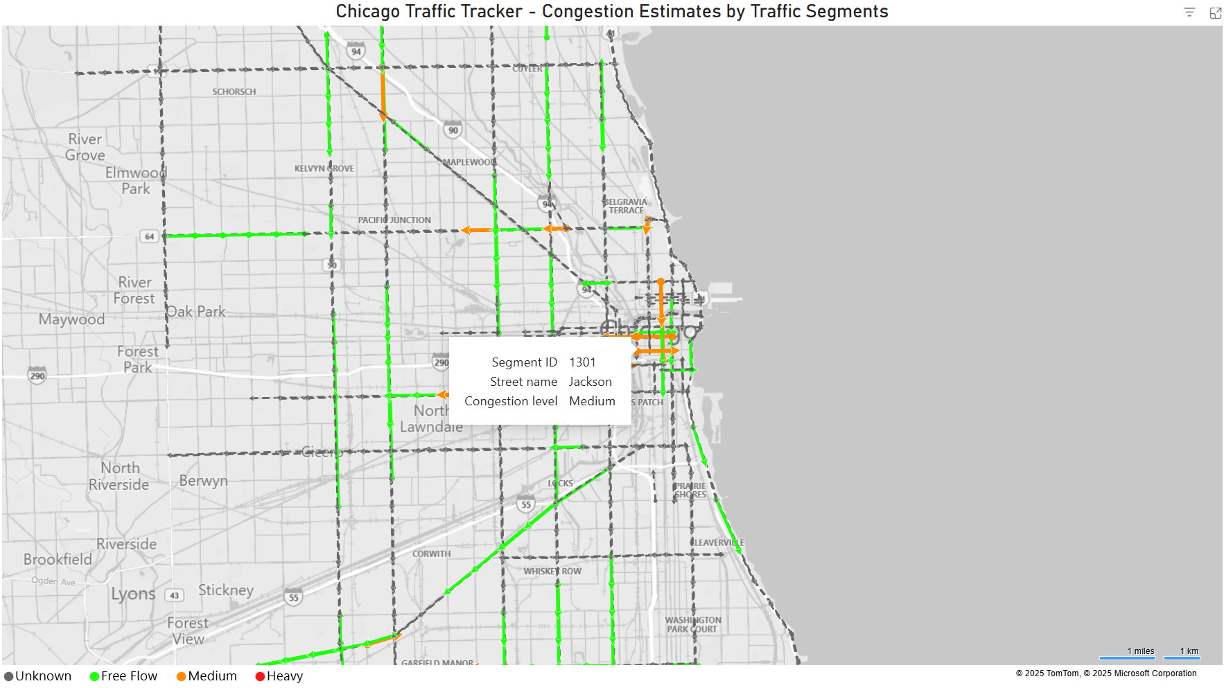 A Power BI visual map to analyze semi-real-time congestion levels in Chicago city using traffic sensor data.