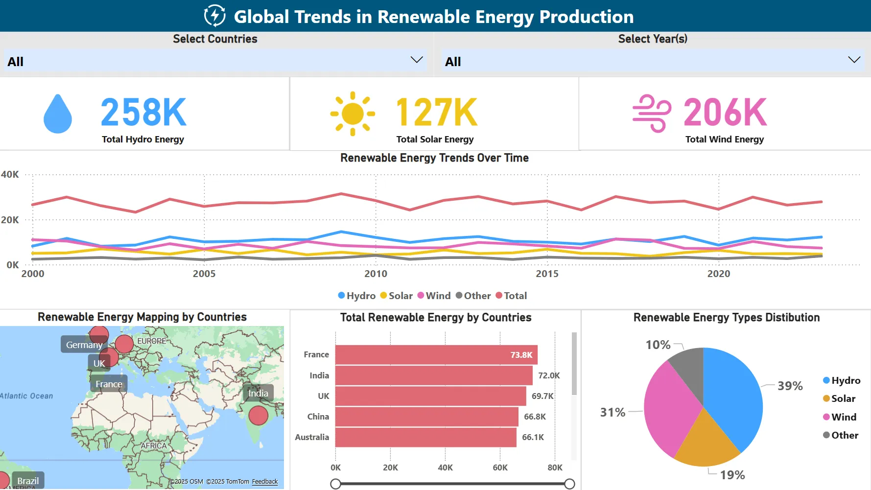 A Power BI dashboard analyzing worldwide renewable energy production trends, focusing on hydro, solar, and wind energy sources across different countries.