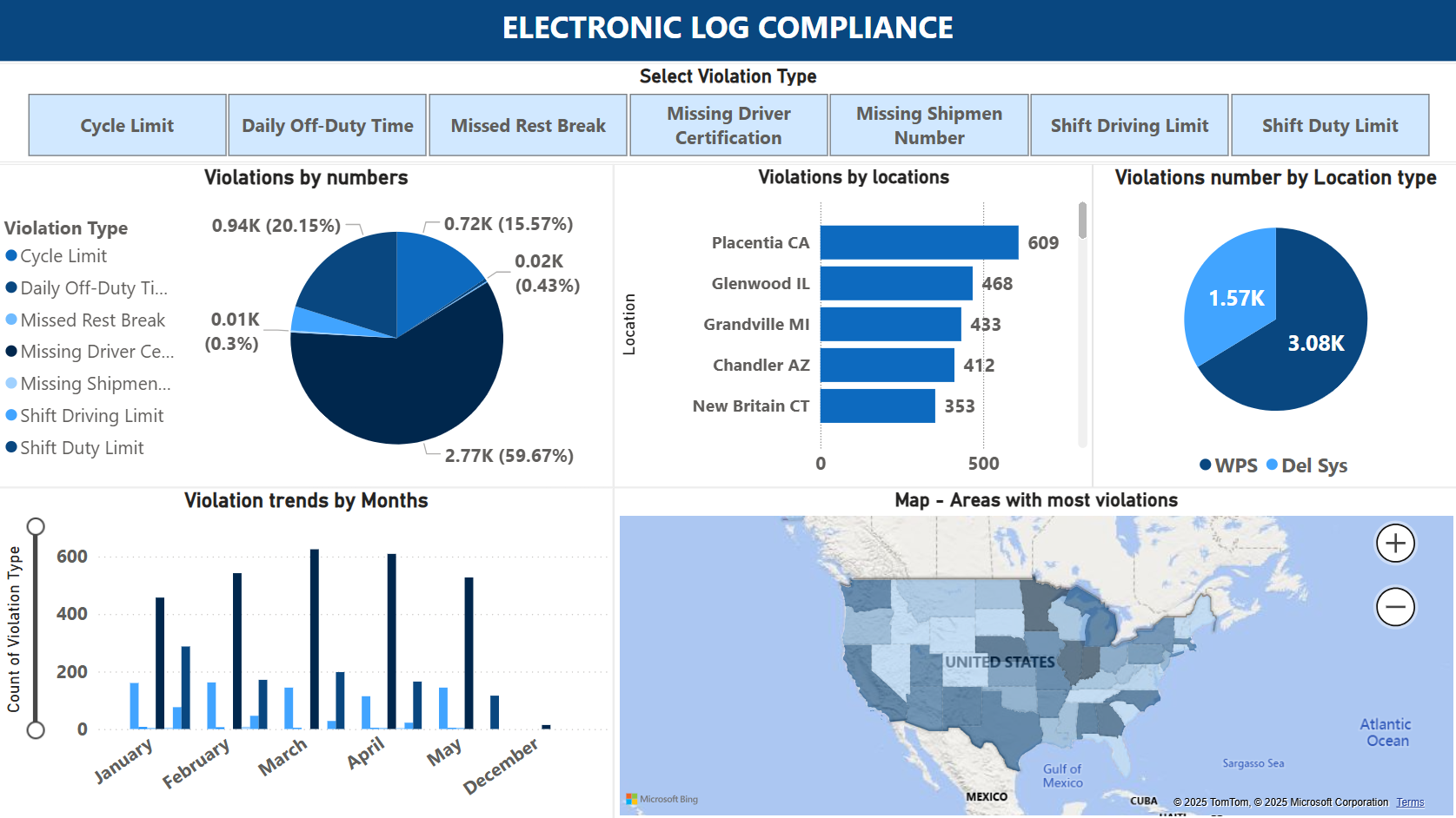 A comprehensive Power BI dashboard for analyzing driver compliance, safety metrics, and risk factors across multiple dimensions including CSA scores, electro...